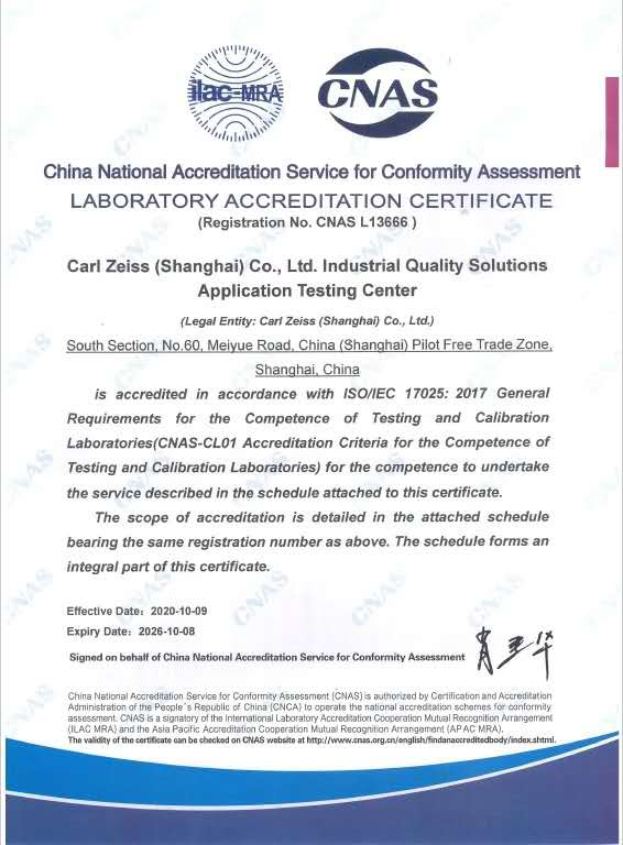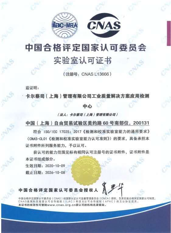 近日,卡尔贺州蔡司(上海)管理有限公司工业质量解决方案应用检测中心经过中国合格评定国家认可委员会(CNAS)严格的现场评审和后续考察,正式通过了最终审评并获得实验室国家认可证书。至此,标志着蔡司应用检测中心具有了国家及国际认可的管理水平和校准能力。